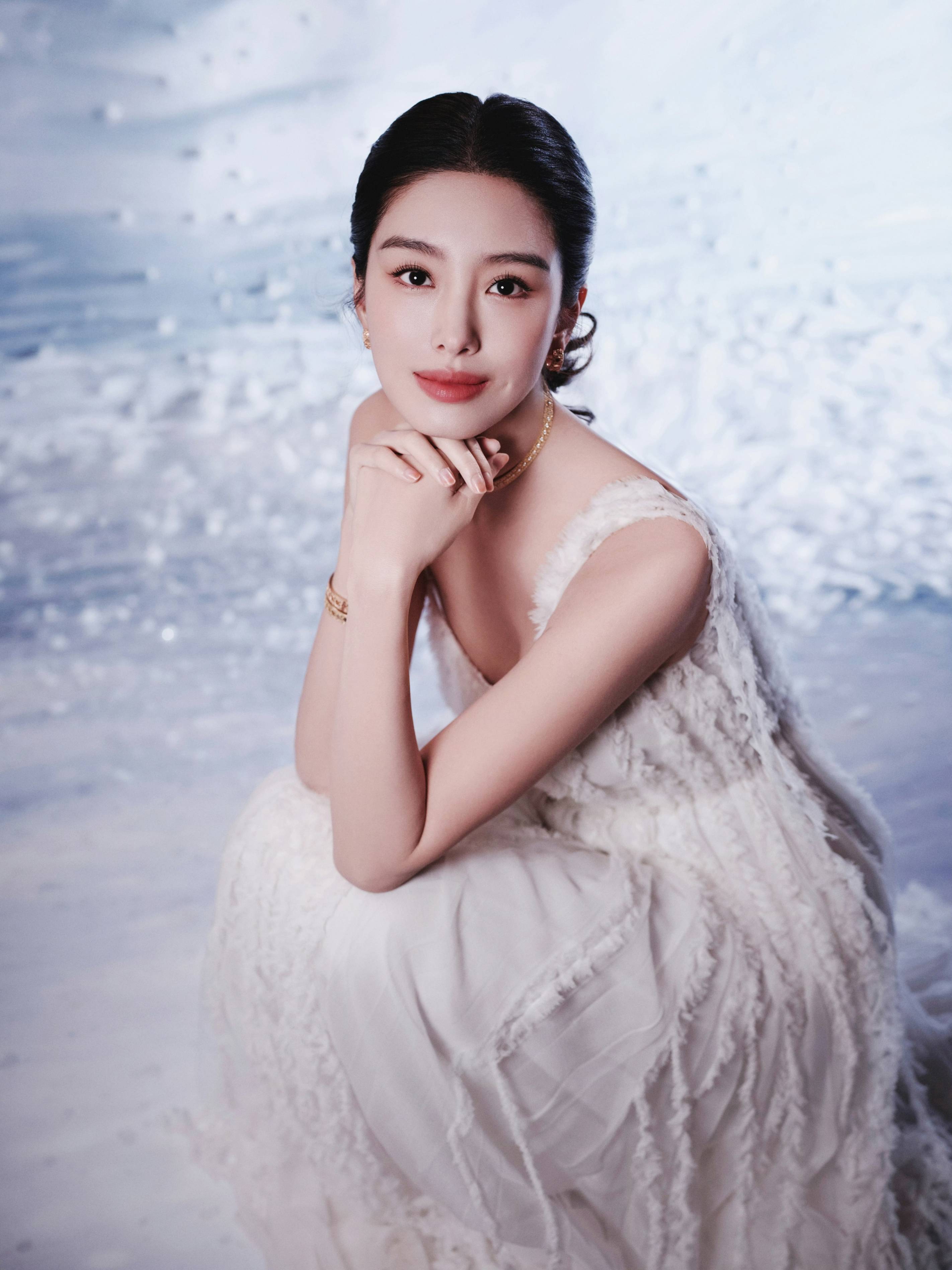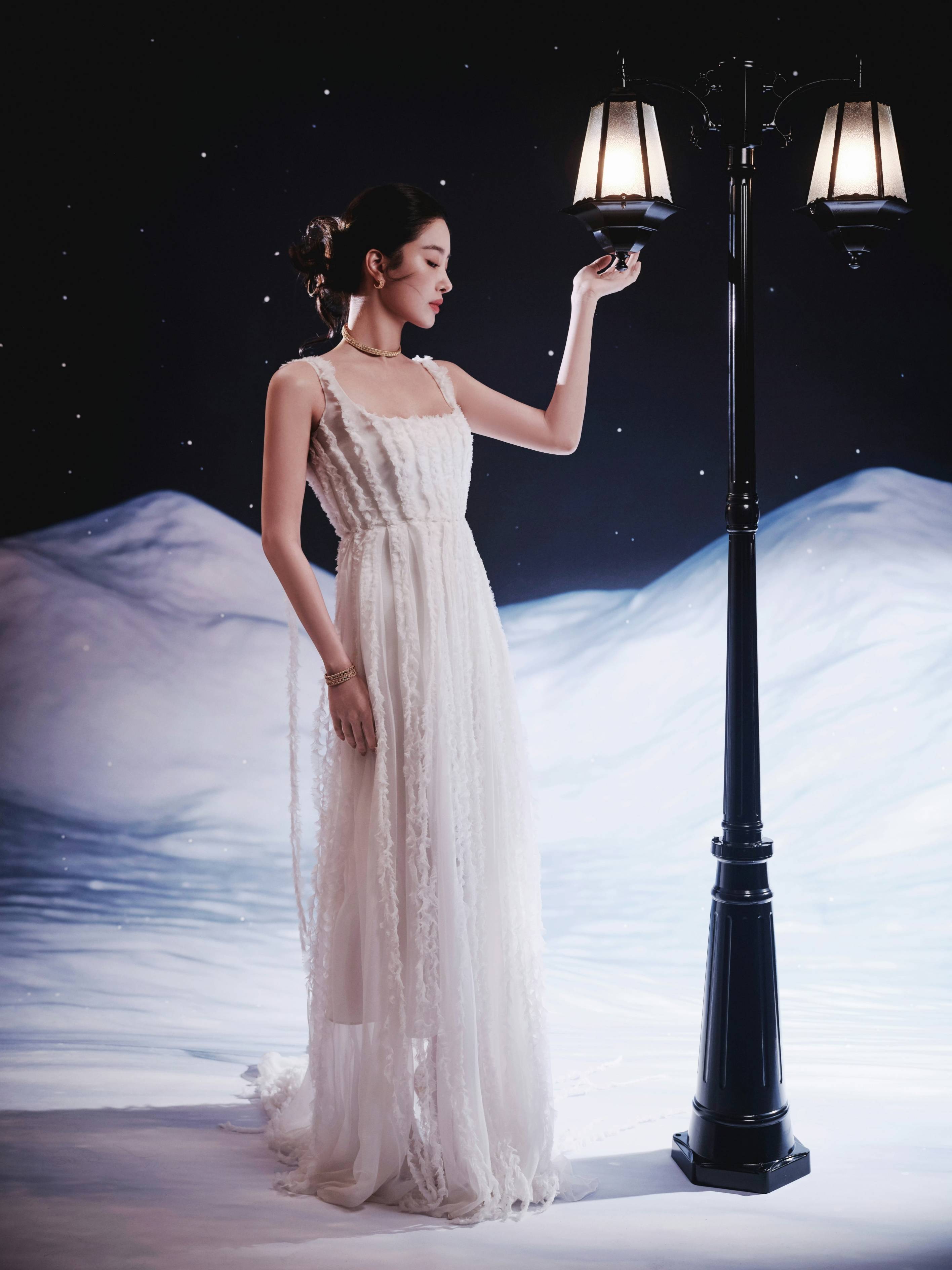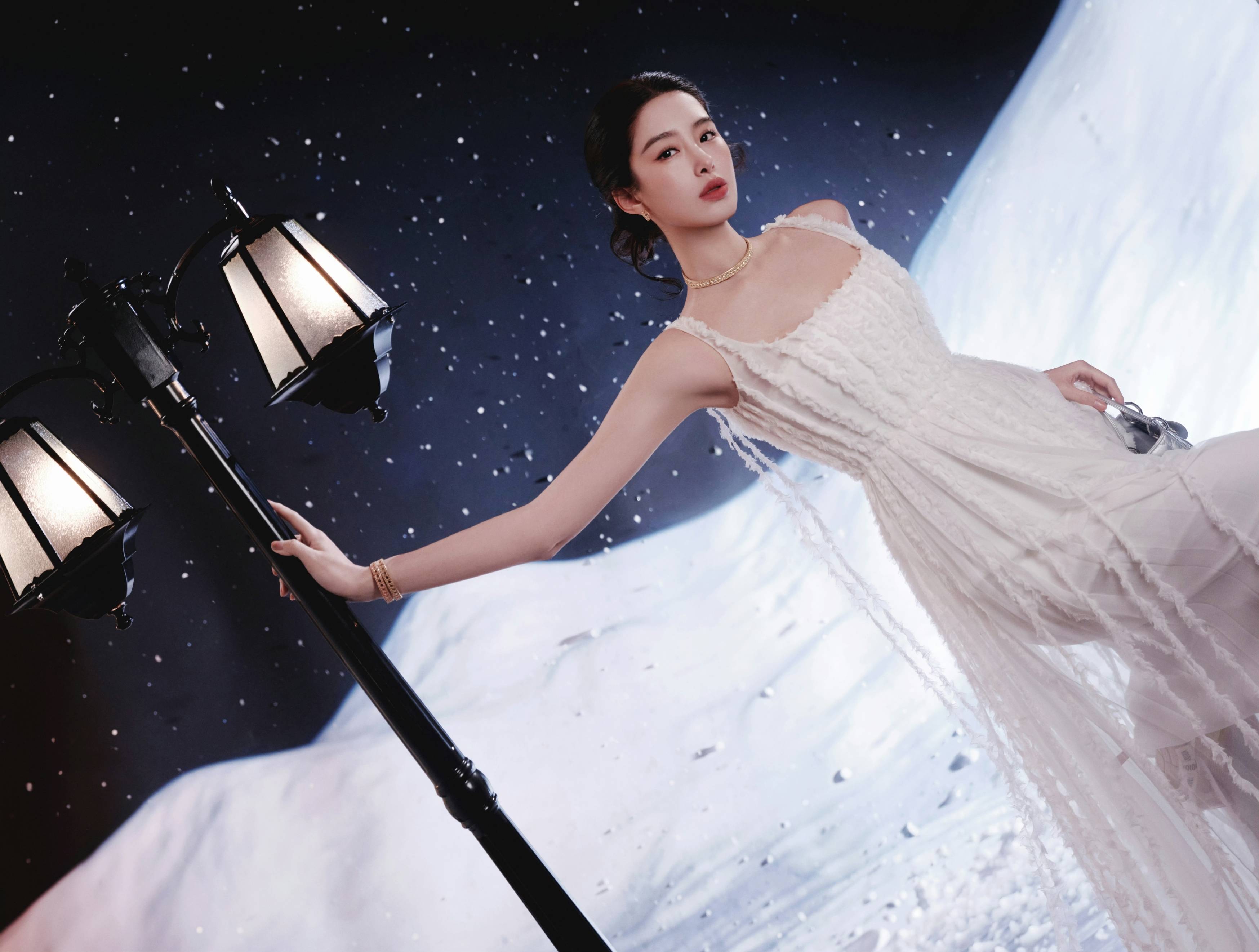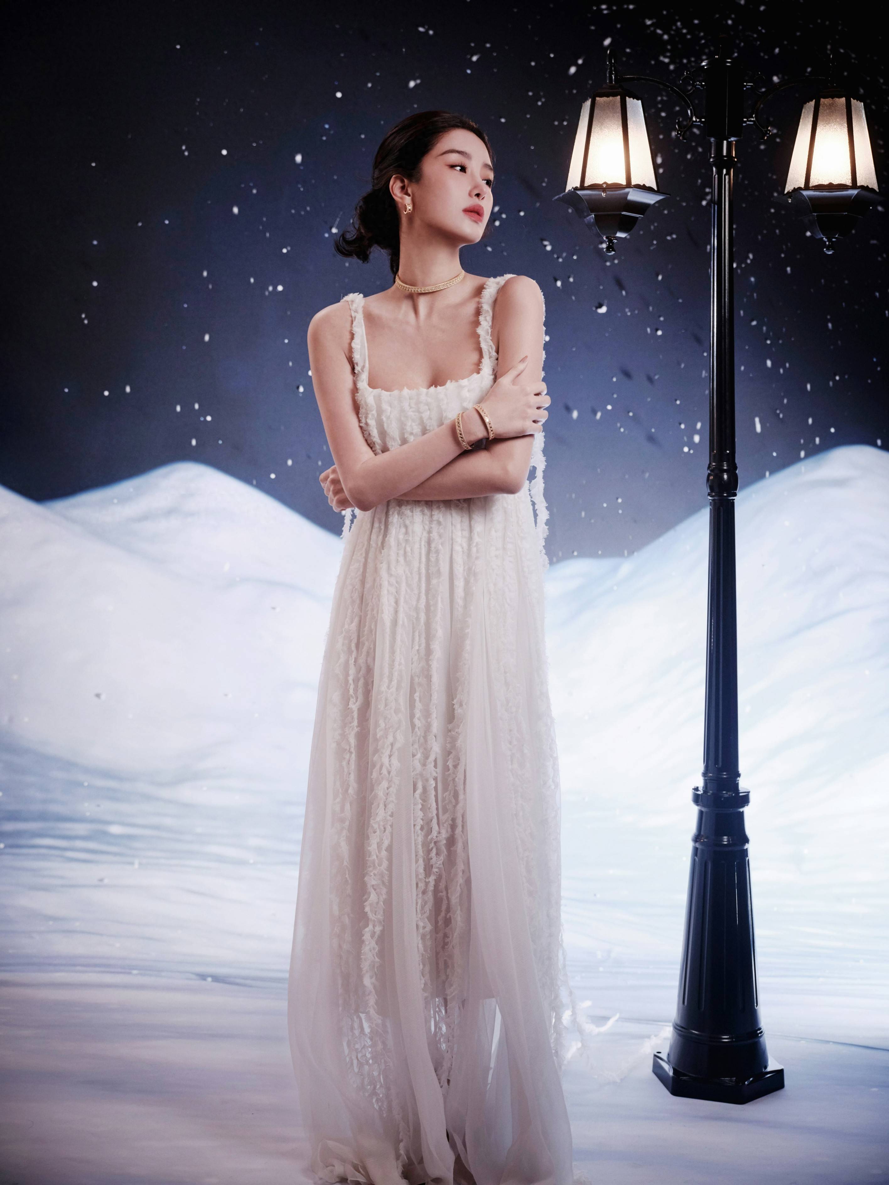 雪幕中白裙裹柔纱之轻,金饰缀出细碎光芒